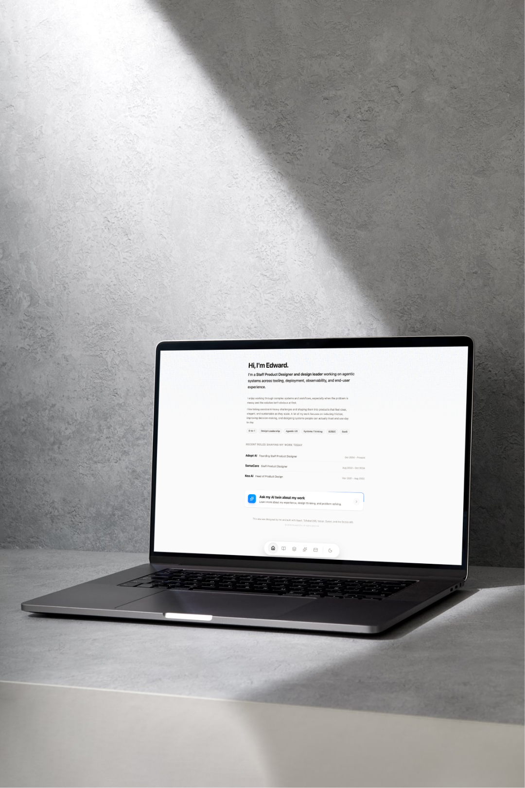 Explore my AI-powered portfolio, designed and built by me using a modern dev workflow with Git, Vercel, and a conversational interface.
